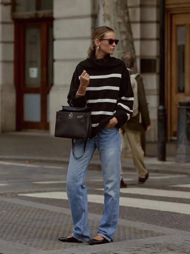 又或是以黑白条纹毛衣搭配蓝色牛仔裤,针织的细腻与丹宁的粗犷彼此映衬,无需刻意勾勒曲线,宽松的轮廓反衬出身形的清瘦纤巧,行动间尽是舒展与自在。