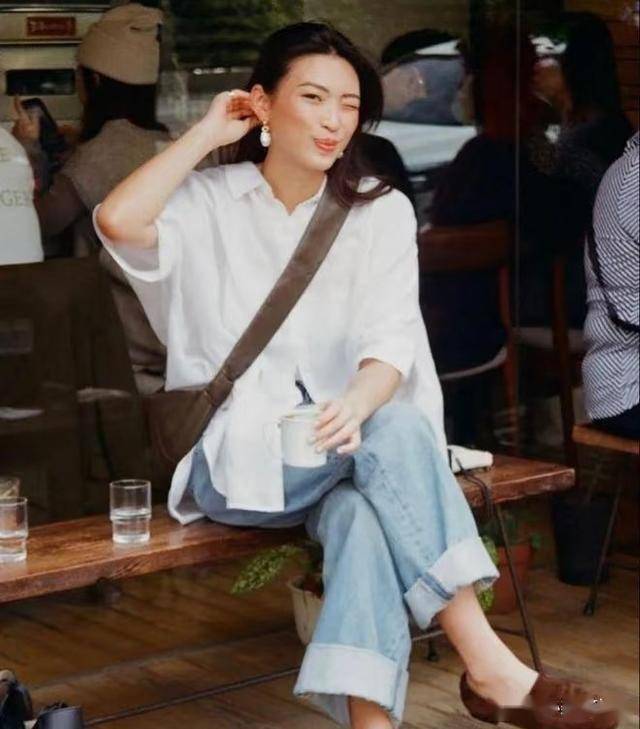 宽松的廓形白衬衫,带着慵懒随性又清新的氛围感,可以配一条浅蓝色的牛仔九分裤,配色非常干净自然,透着明朗洒脱的少年感,减龄又显高级。