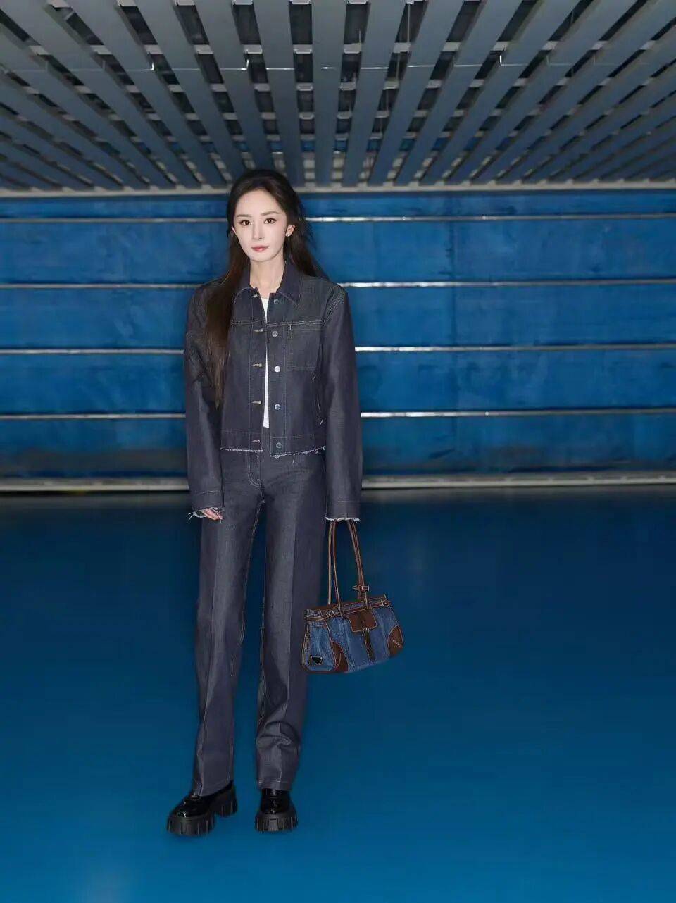 PRADA代言人杨幂选择一身丹宁套装启程米兰,其利落挺阔的版型尽显优越身材比例。搭配同材质Bonnie手袋,更添几分简单随性。