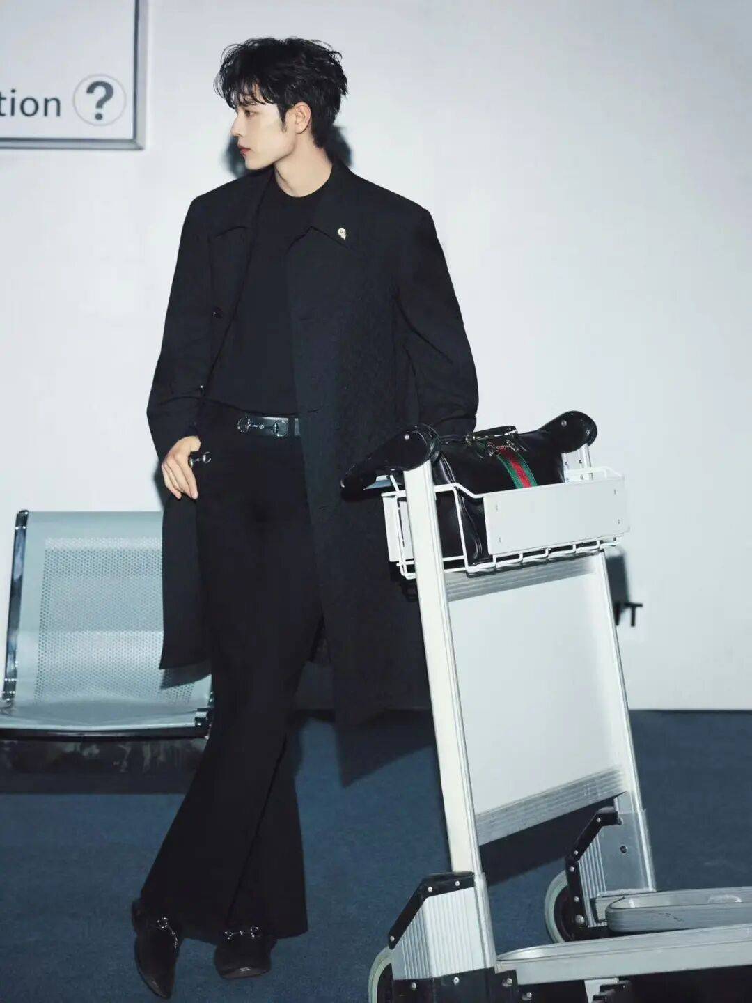 GUCCI品牌代言人肖战的出发造型以一袭暗纹提花大衣叙写内敛大气风度。马衔扣腰带与波士顿包于细节处点缀经典标识,整体造型兼具优雅与气场。