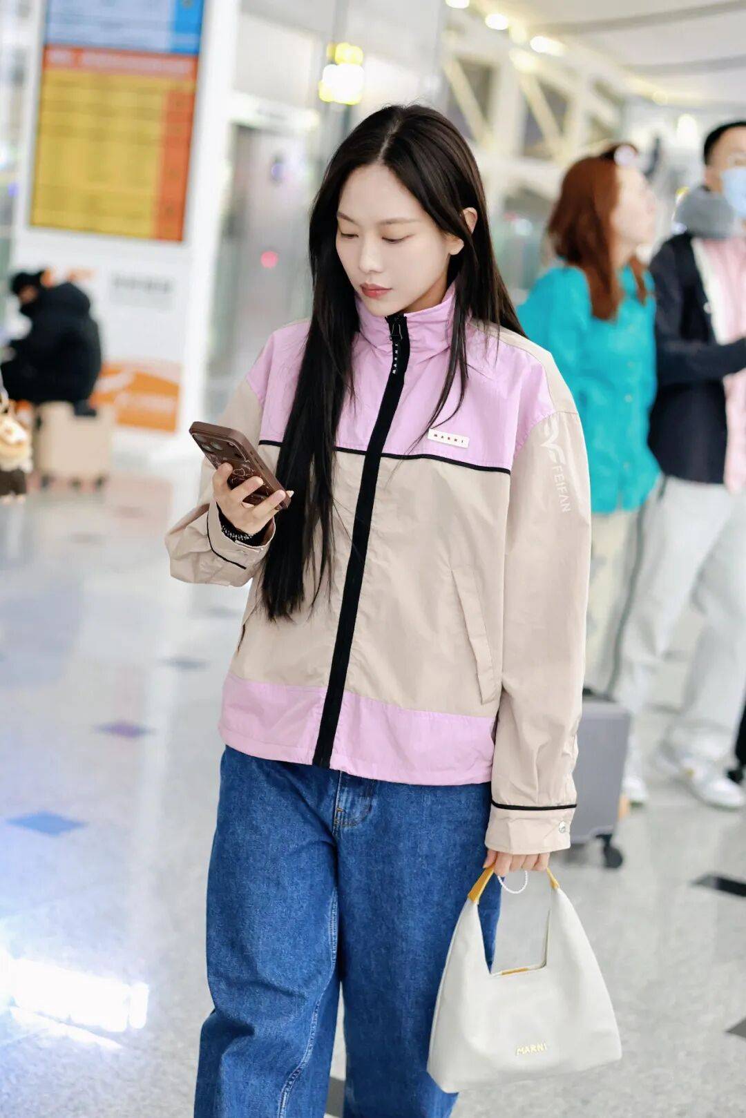 王霏霏身着粉棕拼接休闲外套搭配撞色牛仔裤,将暖调复古感与丹宁的率性完美融合。整套造型摒弃刻意堆砌,在舒适随性与精致时髦间找到绝佳平衡,元气满满的状态正是米兰街头最动人的注脚。