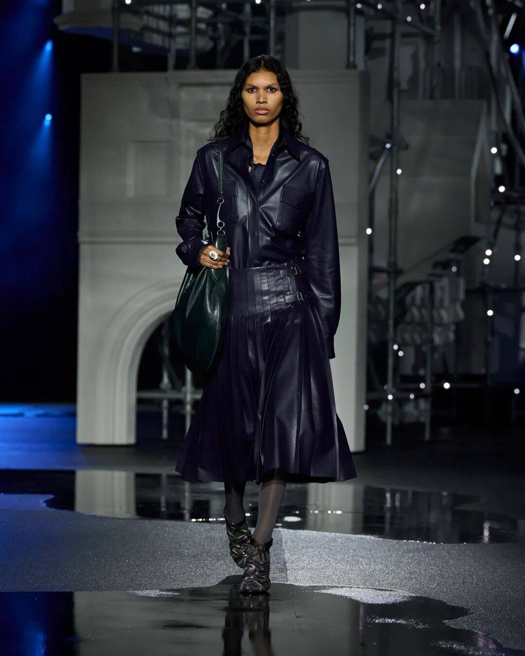功能性单品被赋予晚装质感,皮革飞行夹克、连帽衫与风衣焕发优雅气息。整体造型明确而坚定,纯粹而饱和的色彩尽展精致利落的摩登格调。