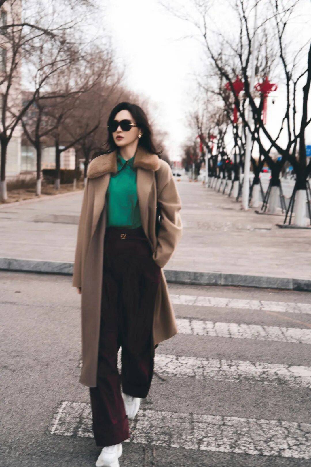 丝绒质感的酒红色西装搭配深V领内搭,珠宝配饰提升奢华度,突出冷白皮优势与雕塑感五官。
