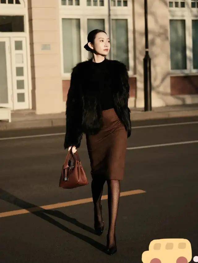 若是喜欢偏爱高贵感的穿衣风格,同时呈现出凹凸有致身材,不妨选一件黑色皮草内搭修身款针织打底衫,加上一条直筒半裙,展现出你的好身形又显得比较有质感。