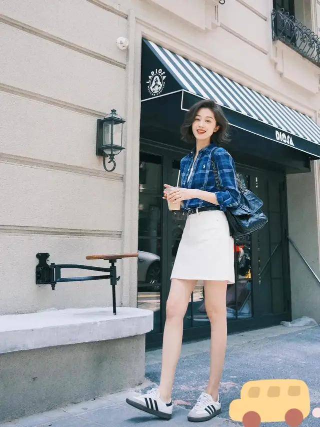 想要更俏皮洋气有个性的打扮风格,可选天生就拥有时尚元素的格纹衬衫内搭白 T 恤,加上一条直筒短裙,脚踩一双经典款式的德训鞋,下衣适中穿法,呈现出大长腿的优势。