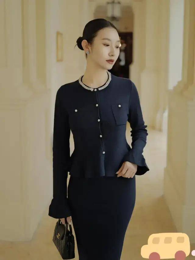 若是自己更偏爱成熟稳重的打扮风格,不妨可以选择上面这一套藏蓝色的小香风包臀裙装,上衣设计很特别,腰线位置做了收腰,更好呈现身材线条,衣角做木耳边伞状外扩设计,增添造型的温柔元素,包臀裙裙可更好地呈现下半身的曲线。