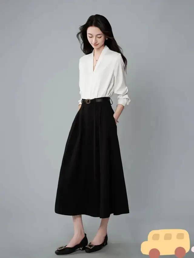 若是更偏爱沉稳大气的穿衣风格,不妨直接选择白色小众衬衫搭配黑色 A 字伞裙,脚踩黑色低跟单鞋,黑白搭配更能让咱们穿出干净随性的气质日常造型。