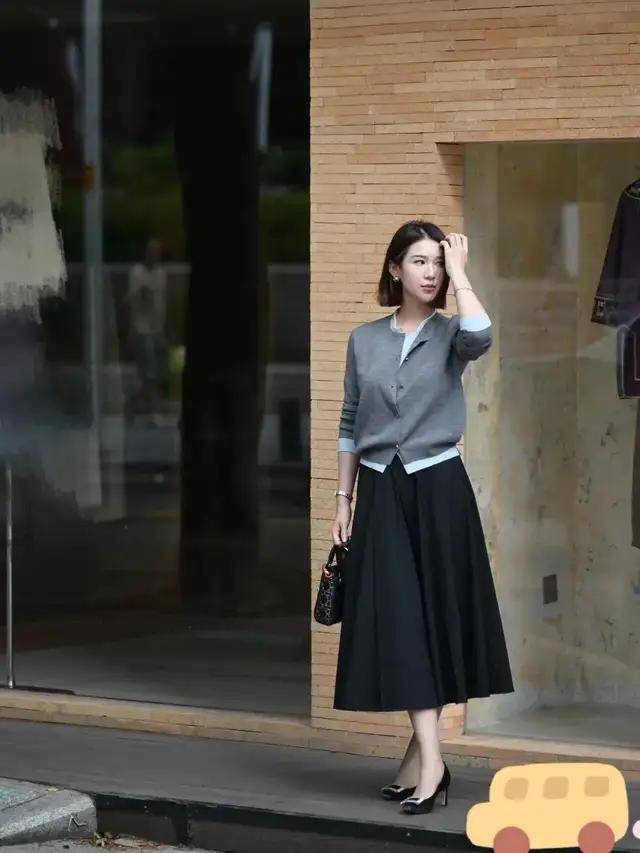 自己更喜欢层次感分明的穿衣风格,可选一件短款的灰色针织开衫,内搭蓝色打底衫,下装选择压褶黑色伞裙,脚踩黑色粗跟单鞋,就能形成撞色效果,色彩更分明,层次感更好。