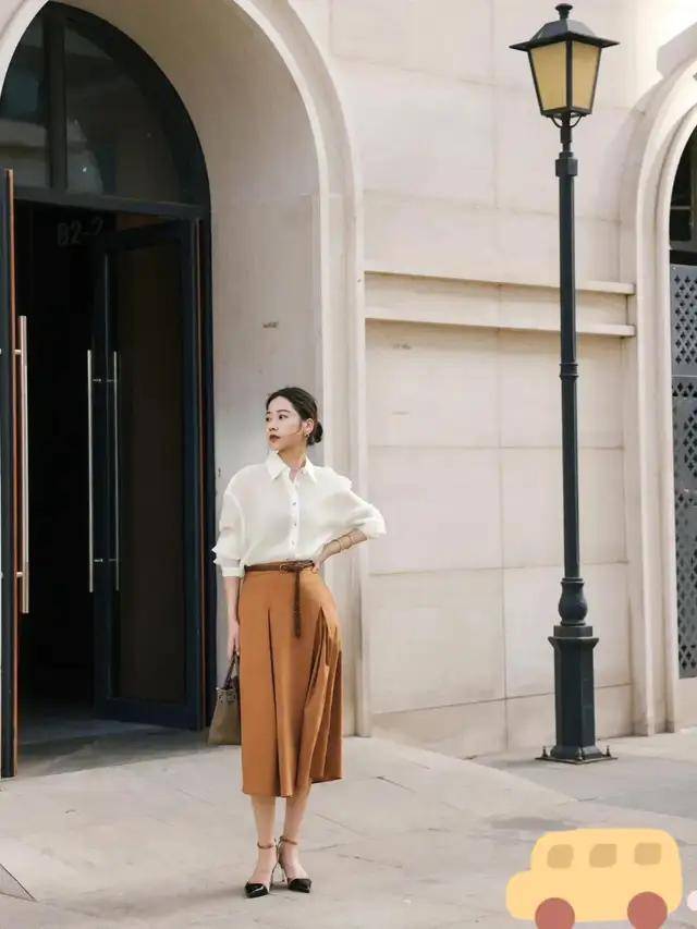 咱们还可以直接选择一件白色衬衫配上驼色系伞裙,脚踩拼接色高跟单鞋,既经典又耐看,活力感满满,