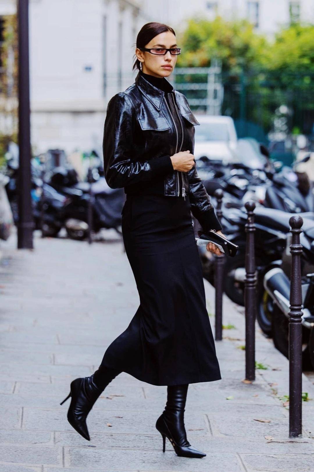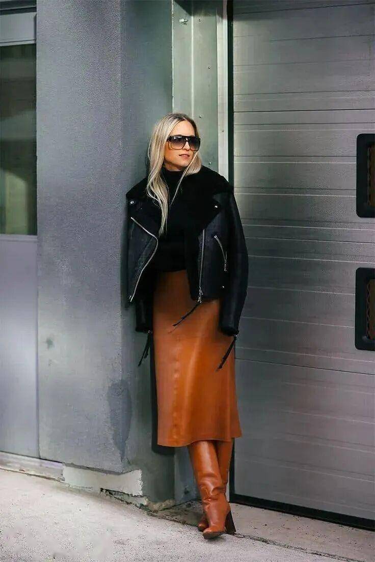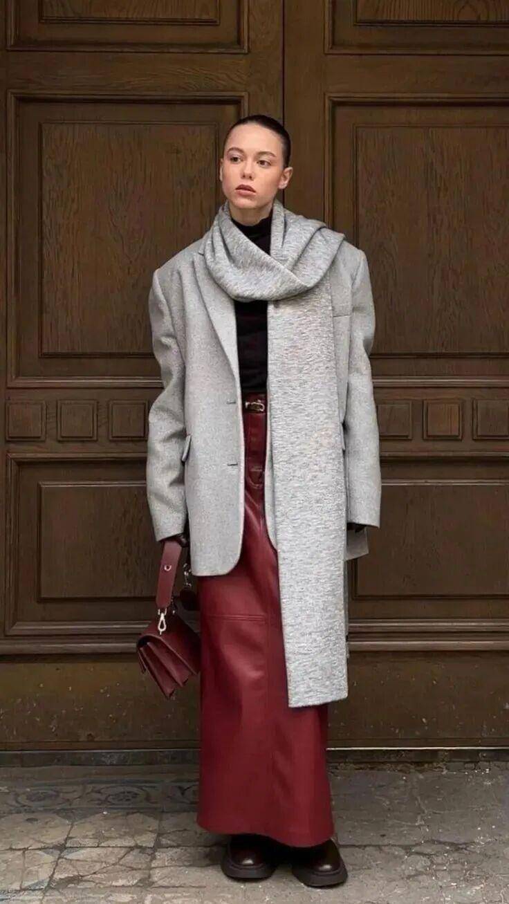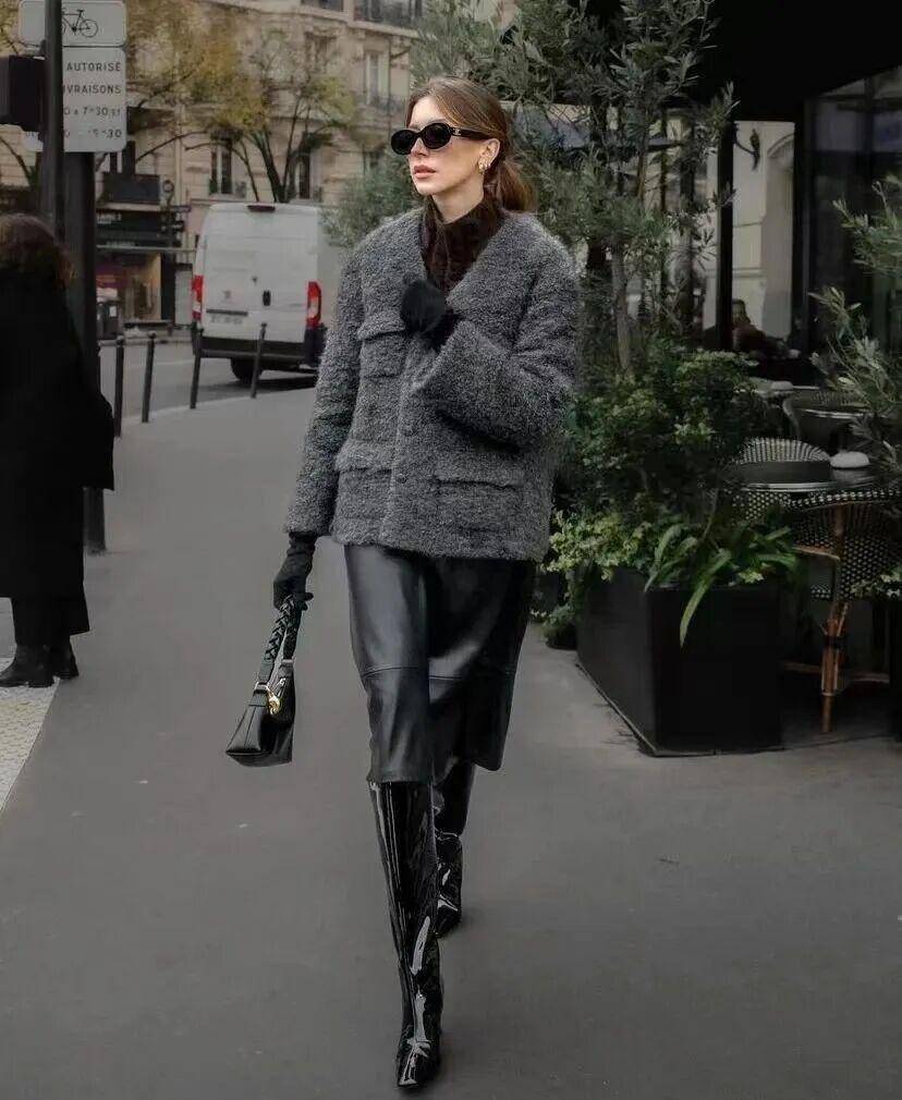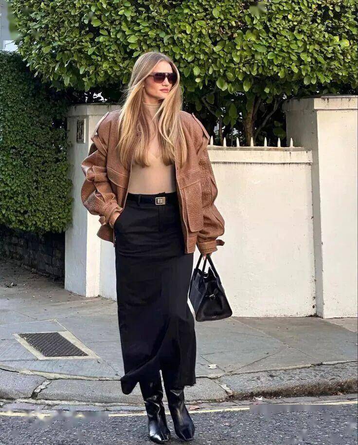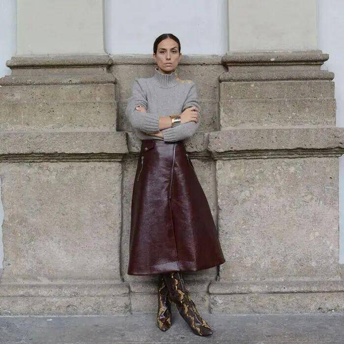 受西装半裙的流行影响,直筒皮革半裙成了冬日爆款,利落大气。