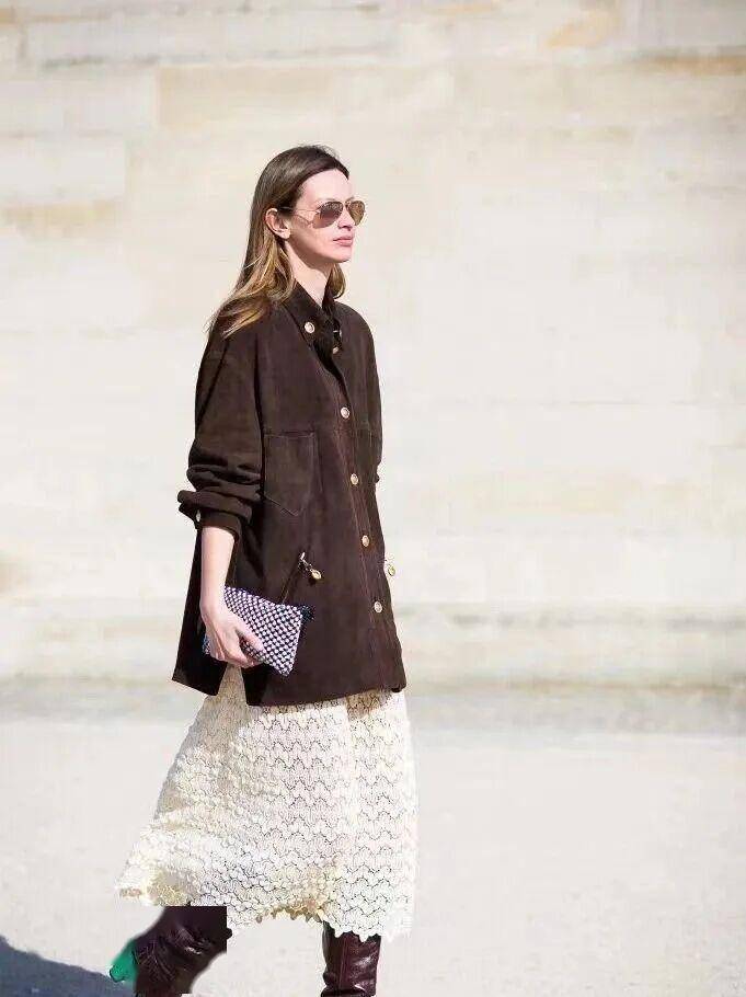 灰色半裙邂逅棕色麂皮外套,就像加了一层“复古滤镜”,日常逛街回头率100%,通勤社交很有个人品味。