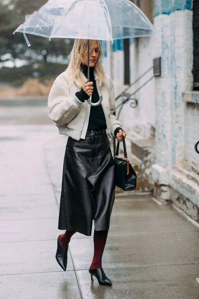黑色的生人勿进、棕色的复古浓郁、酒红色的优雅冷艳,是皮革半裙的主流配色,高级又不挑皮。