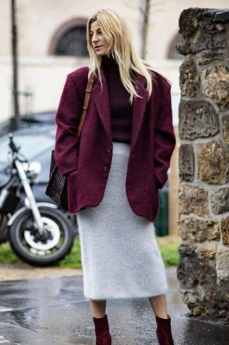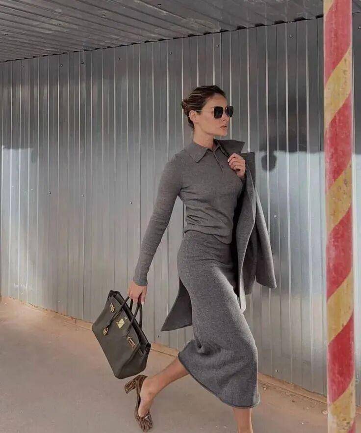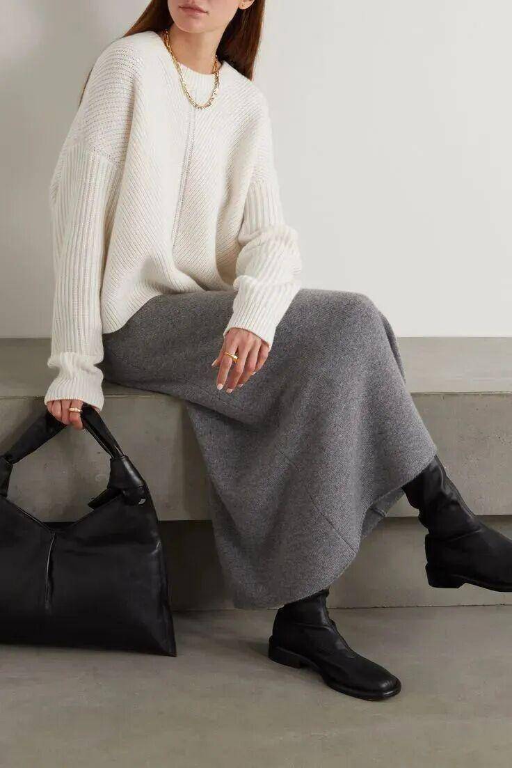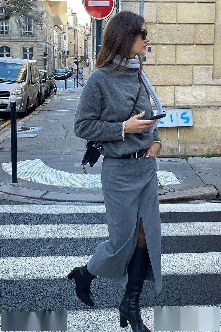 线条感笔直流畅的灰色直筒裙,用毛衣的柔润感平衡,实穿度、时髦感都被推到顶端,让造型多一份质感。