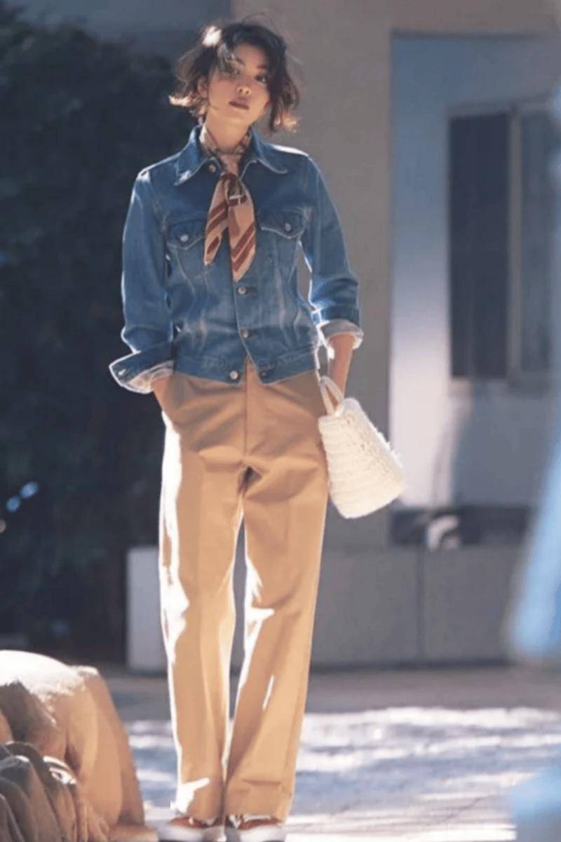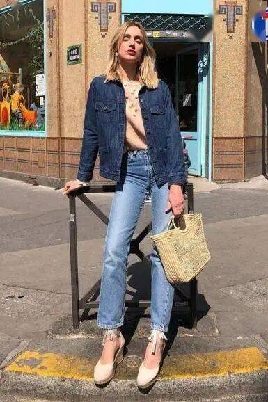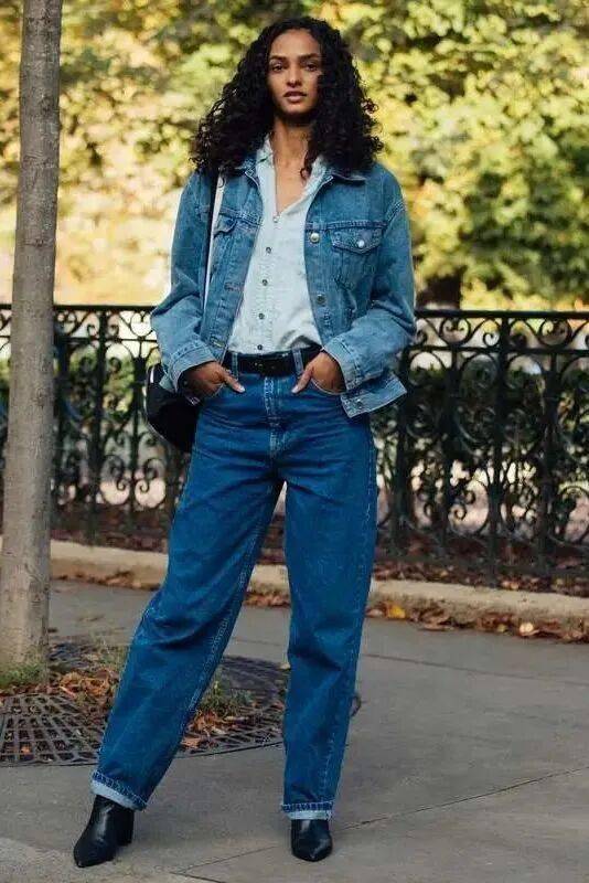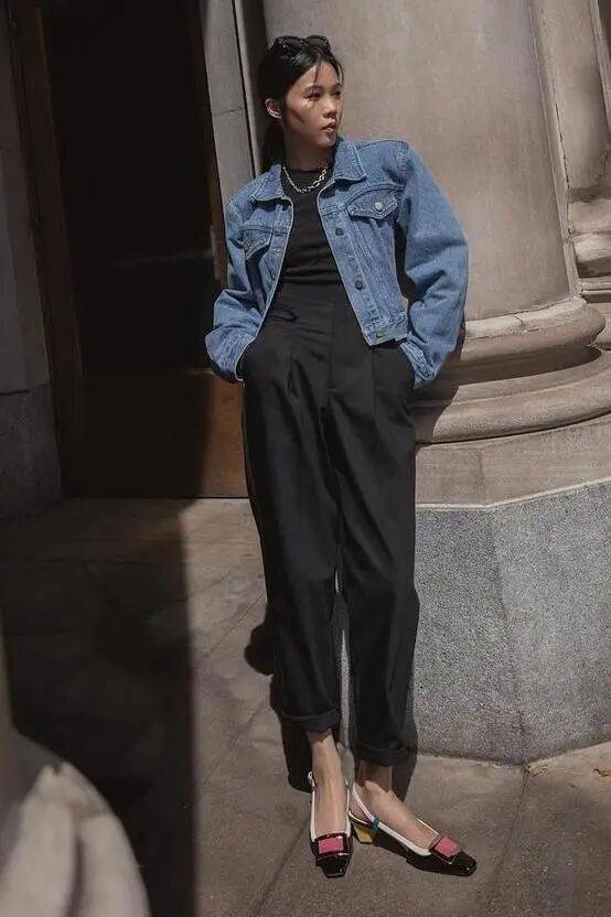 小个子:首选短款牛仔外套,卡在腰线附近,视觉拉高比例,显高显腿长 。
