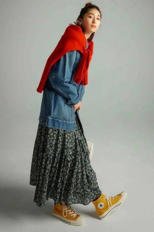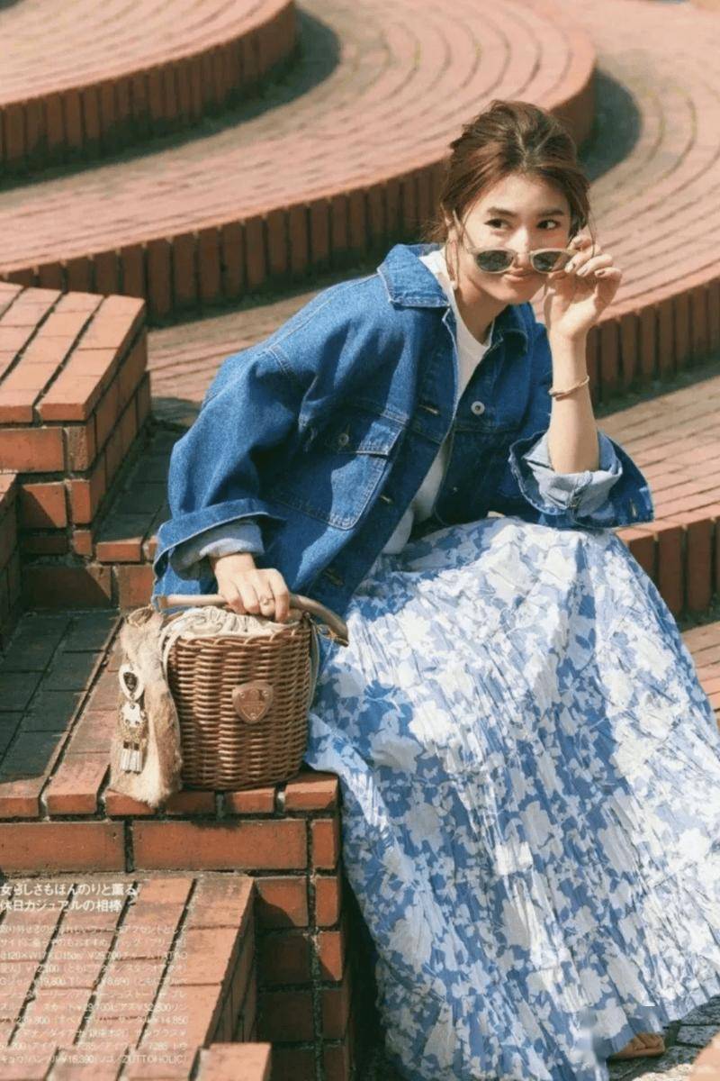 浅蓝牛仔+暖调碎花裙:如橘色、铁锈红,提亮肤色,更有春日氛围感 。