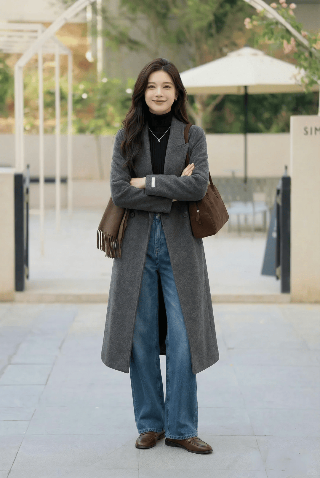 大衣的版型利落又高级,自带优雅气质,尤其是经典的灰色大衣,内搭黑色修身针织衫打底,下半身衔接窄版牛仔直筒裤,再配一双深棕色的平底乐福鞋,略带复古的颜色,瞬间提升整体造型的精致度。