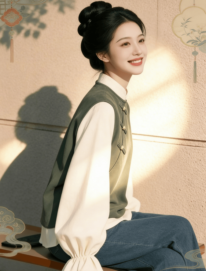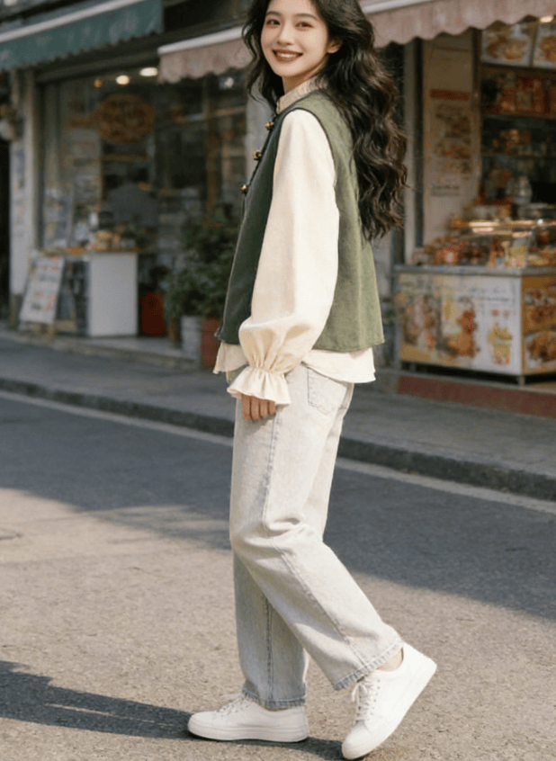 想要更加减龄,可以选择学院风穿法,深蓝色针织马甲叠穿白衬衫,下半身选择九分卷边牛仔裤配褐色乐福鞋,也是妥妥的高级优雅范。