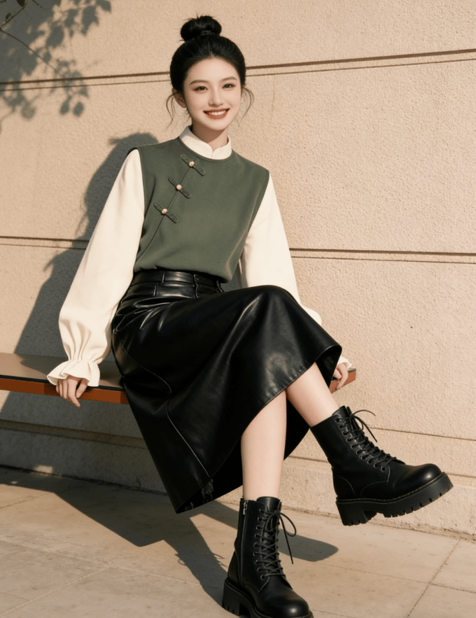 下身配一条黑色皮质半身裙加马丁靴。软糯的卫衣面料和帅气的皮质形成反差萌,又甜又酷,回头率超高!