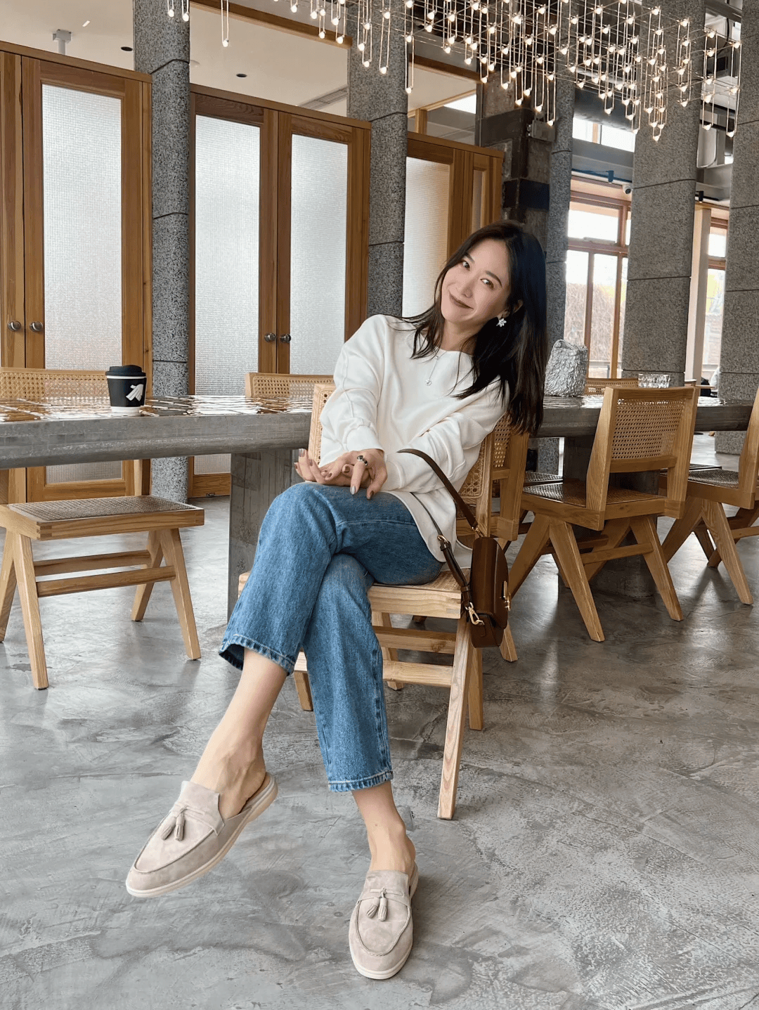 而最显瘦的莫过于九分牛仔裤了,与浅灰色乐福鞋的组合,修饰腿型又显得精致感十足,上半身选择搭配一件米白色套头卫衣,整体造型非常的简约清爽,温柔与质感并存。