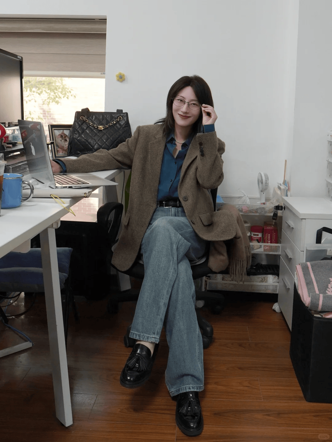 春季穿搭更适合颜色偏浅的单品,可以选择驼色风衣或者大衣,内搭白色打底,提亮肤色,下半身选择九分直筒裤,白色袜子+黑色乐福鞋,简约高级又利落干练的穿搭,走在街上妥妥的都市丽人范儿。二、西装+牛仔裤+乐福鞋