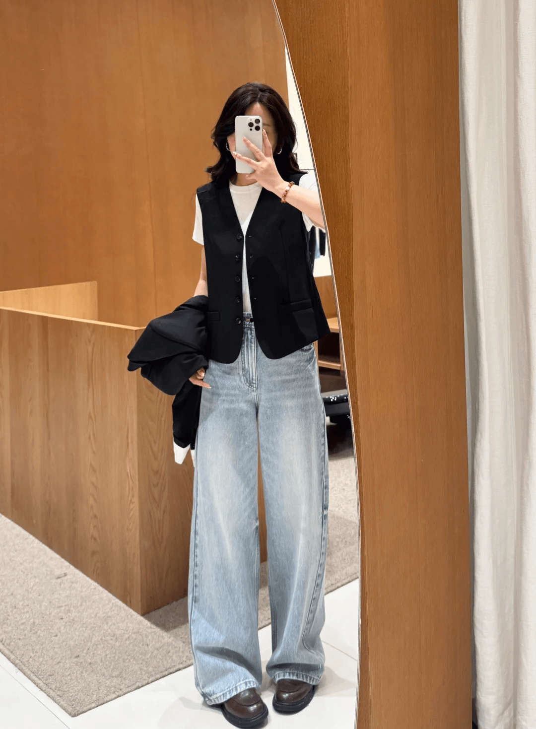 马甲作为辅助类的单品,单穿也是超级有范儿的,黑色小马甲内搭白色T恤,简约又不失高级感,下半身选择水洗蓝色牛仔阔腿裤,将休闲与正式感很好的平衡,再才一双深棕色的乐福鞋,非常的精致又复古。