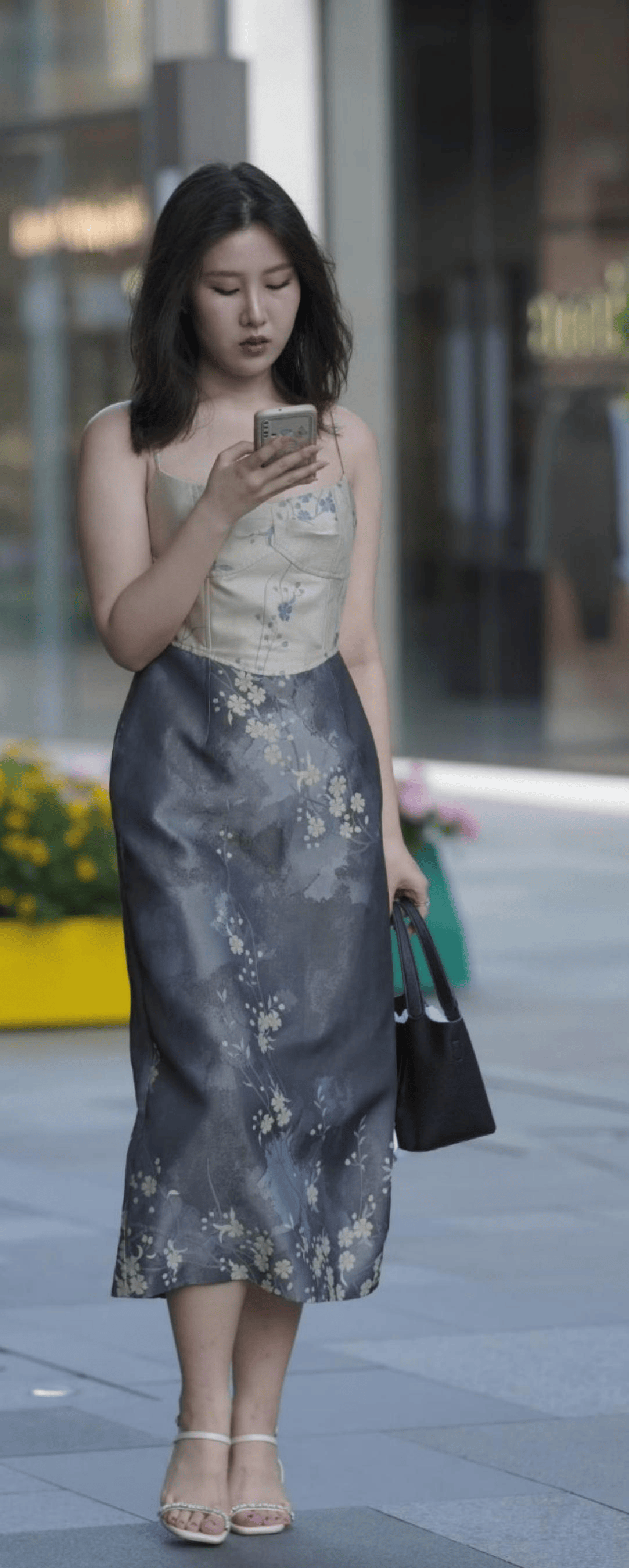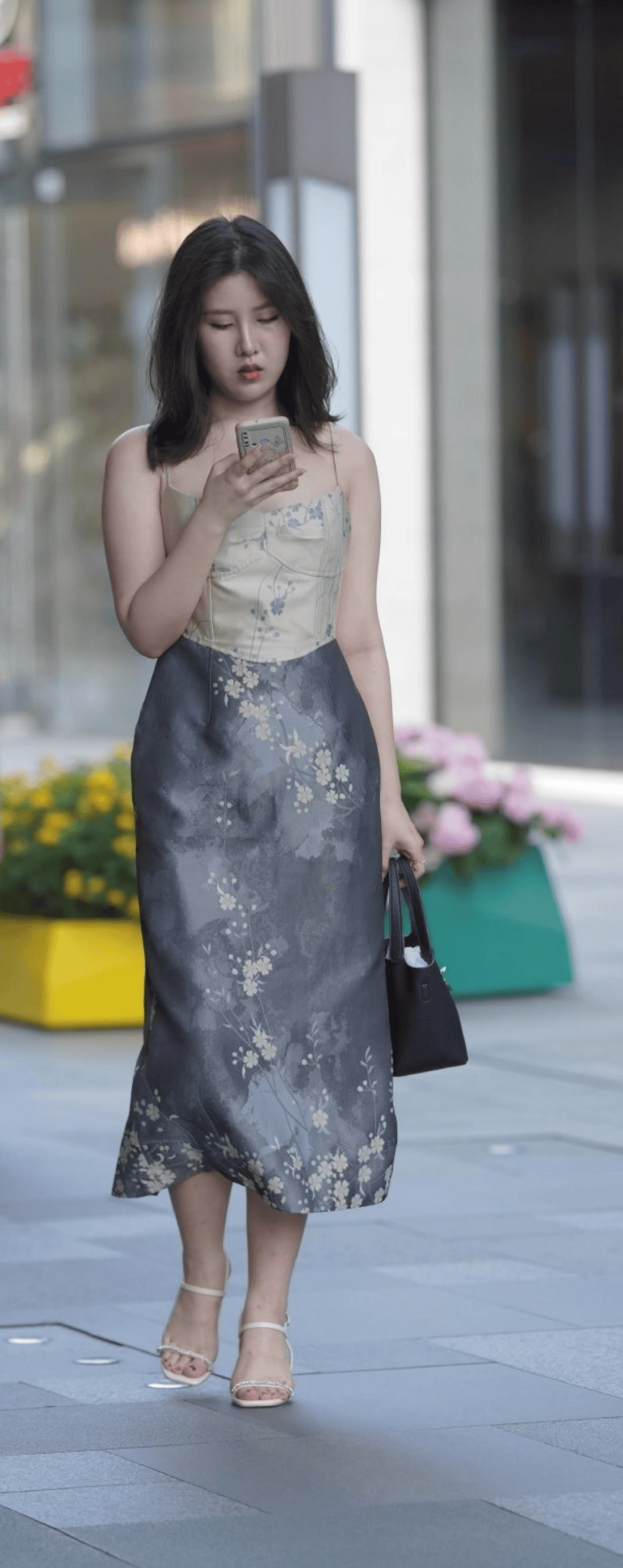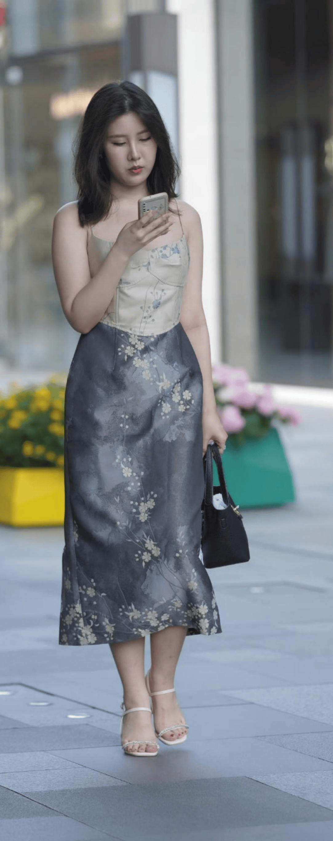 日常约会:浅色碎花露背裙+平底凉,慵懒又清新。