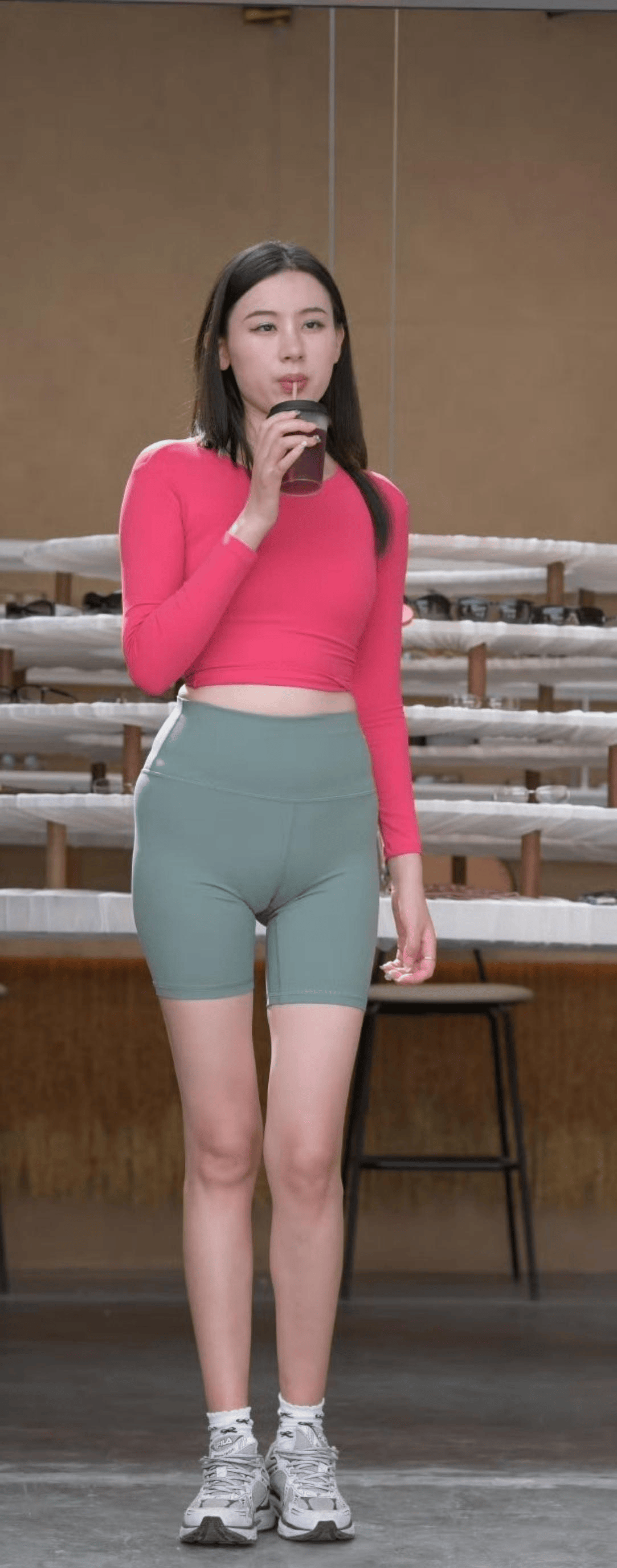 短款上衣+高腰瑜伽裤:露腰设计或打结衬衫凸显腰线,搭配高腰瑜伽裤拉长腿部比例,视觉显瘦。
