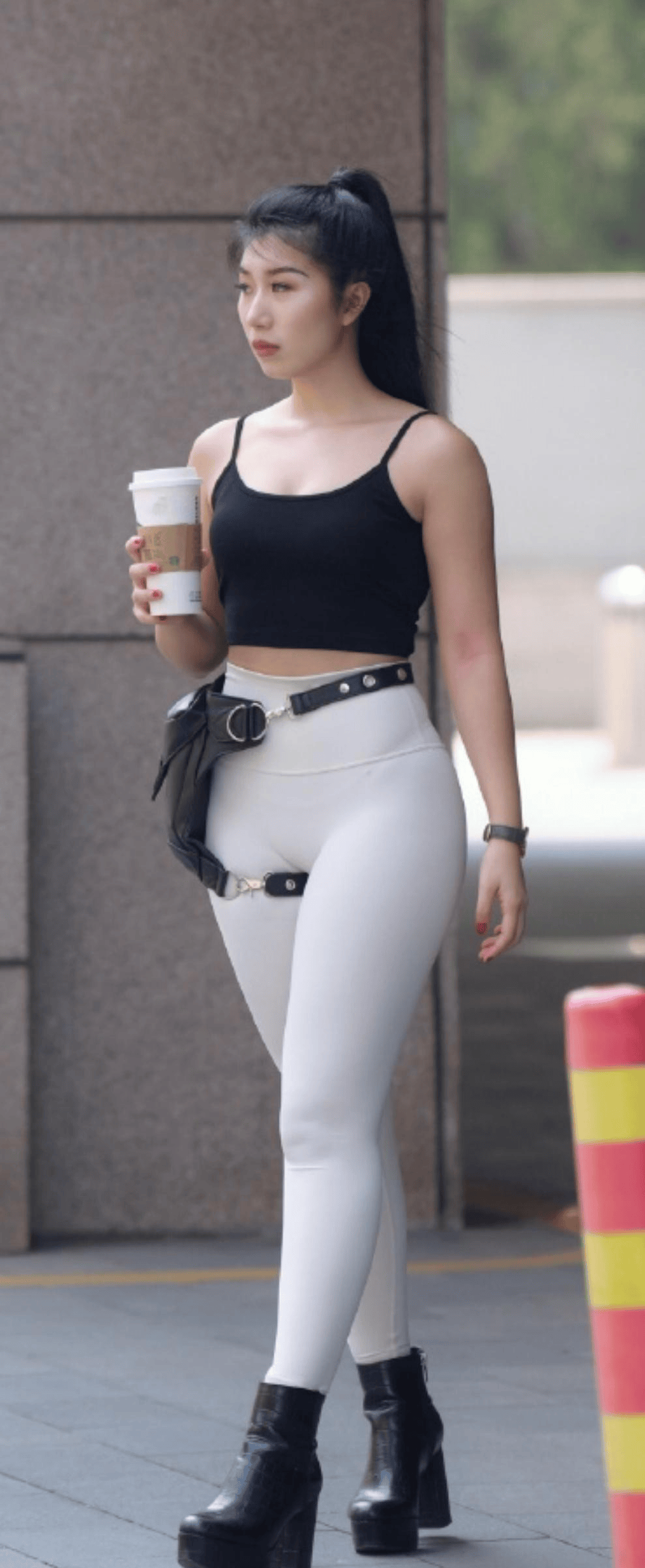 职场通勤:黑色瑜伽裤+长款风衣+尖头短靴,内搭基础衬衫,用腰带强化干练气质。