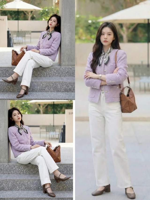 例如上面这位时尚达人,直接选择一件紫色的小香风外套,搭配上白色的牛仔直筒裤,脚上踩着一双棕色的玛丽珍鞋,这样的穿衣打扮既简约又显贵,美出了新的高度。