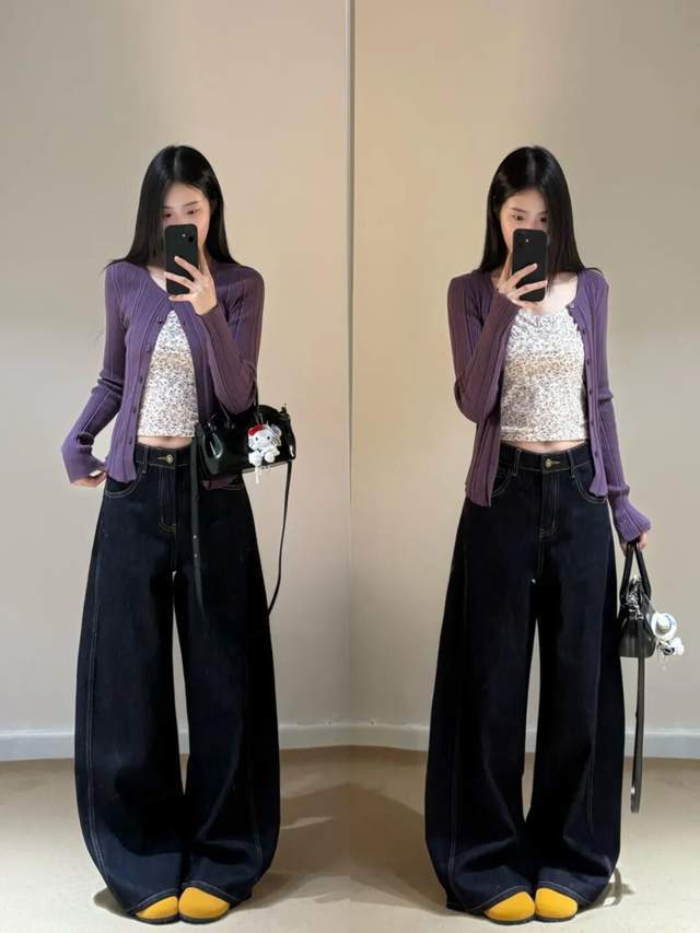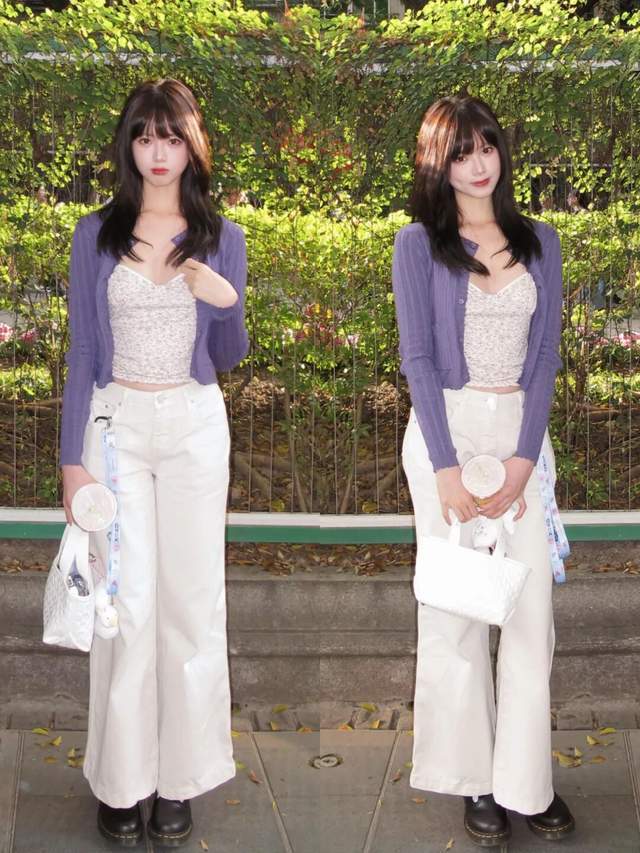 而且还有一点,紫色的衣服不挑年龄,不同的年龄穿出来视觉效果完全不同。若是长相甜美可爱 00 后美少女,穿的紫色的针织开衫,内搭一件小吊带和一条白色的阔腿长裤,呈现效果甜美可爱,少女感扑面而来。