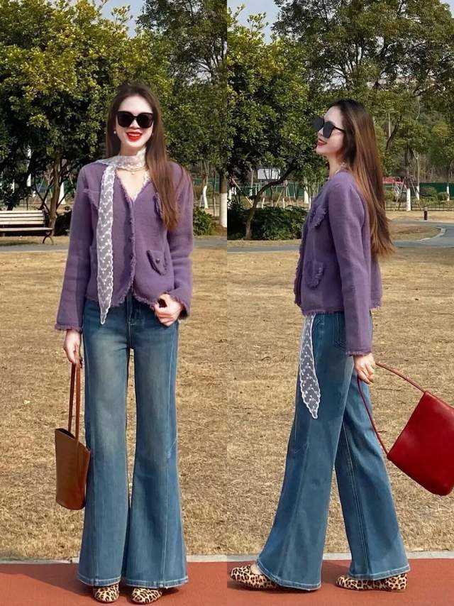 若是想要呈现自己的大长腿优势,我们不妨可以直接选择紫色小香风外套,内搭白色的打底衫和一条微喇叭的牛仔直筒裤,脚上穿的豹纹的平底单鞋,这样的穿衣打扮就能使得身材更显高显瘦。