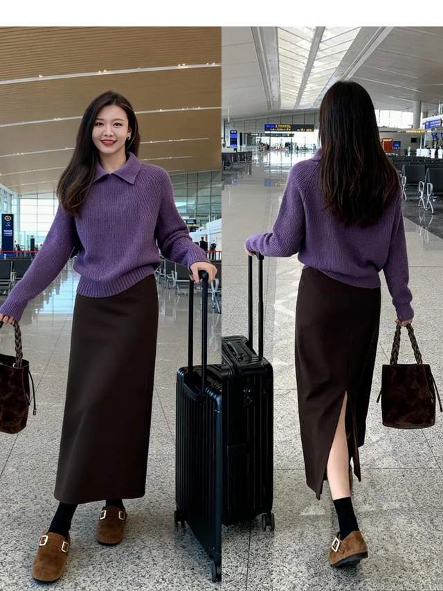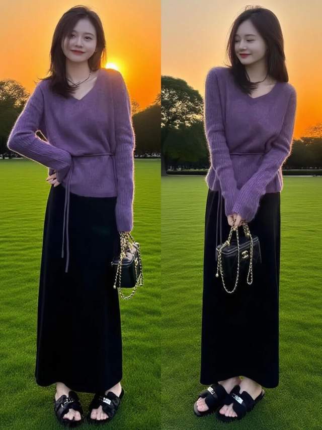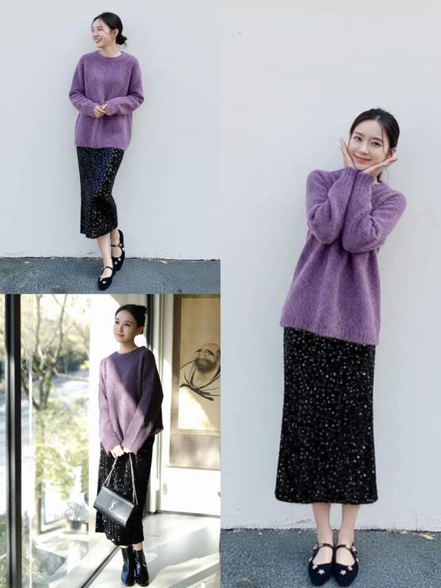 若是咱们偏爱优雅的穿搭风格,可直接选择紫色的针织毛衣,穿在身上软糯亲肤,还能呈现出一种温柔感。但搭配浅灰色的伞状半裙,就可以遮住胯宽腿粗的问题。