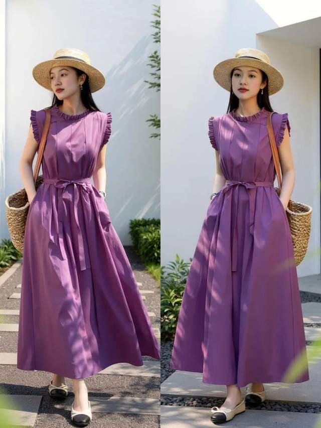 除了穿紫色的衣服让自己变得更加时尚 fashion,我们也要适当的添加一些配饰,比如说上面这一套穿搭,用一顶草帽来点缀,让整体打扮更有氛围感,适合出游的时候佩戴。