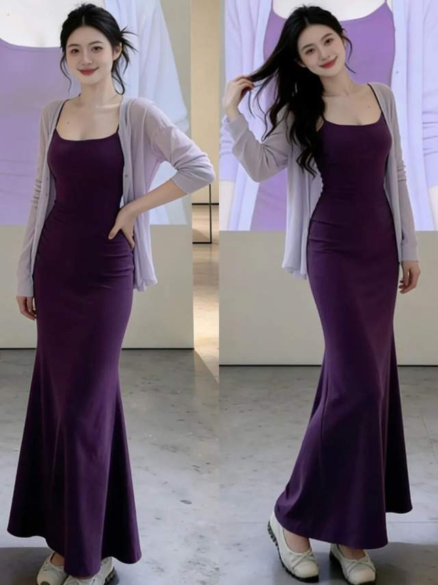 例如上面用一件浅紫色的针织开衫内搭修身的紫色吊带连衣裙,穿在身上确实能呈现自己凹凸有致的身形。