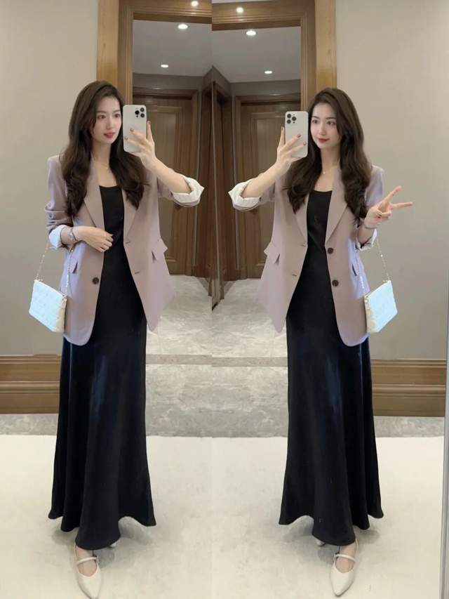 若是偏爱小姨风穿衣风格,不妨可选紫色的西装外套,搭配比较有垂坠感的黑色连衣裙,脚踩一双羊皮材质的浅口平底单鞋,结合大波浪的卷发造型,既优雅又干练。