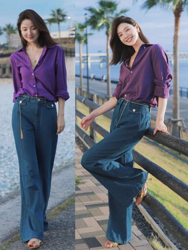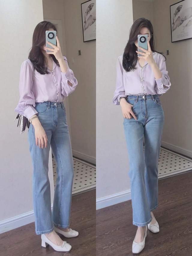 若是更偏爱职场通勤风的情况下,我们可以选择浅紫色的小众衬衫上衣,搭配上一条天生就拥有时尚元素的 9 分牛仔直筒裤,脚上穿着一双粗跟的方头靴,这样的搭配方案既干练又有一种温柔的时尚感,同时又呈现一种休闲风,不管穿去上班、逛街、约会、出门旅游、拍照都很出片。