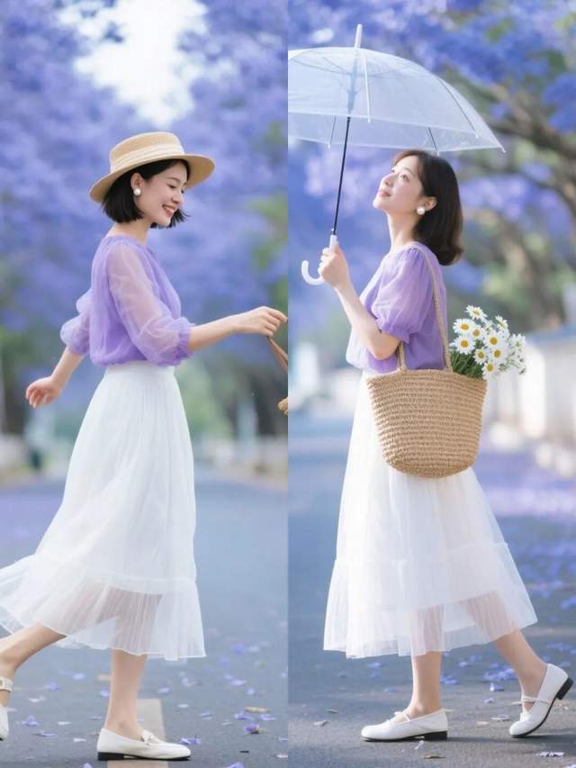 穿紫色衣服想让自己显得更高级大气,我们可以选择比较有质感的半身裙来搭配。