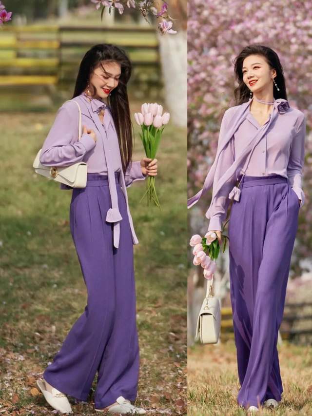 偏爱裤装的利落,不妨一试紫调的层次美学。浅紫小众衬衫搭配深紫西装阔腿裤,同色系的深浅碰撞,自带高级韵律。将衣角轻塞裤腰,腰线立现,三七分比例顺势而成,显高显瘦,飒爽间尽是从容风骨。