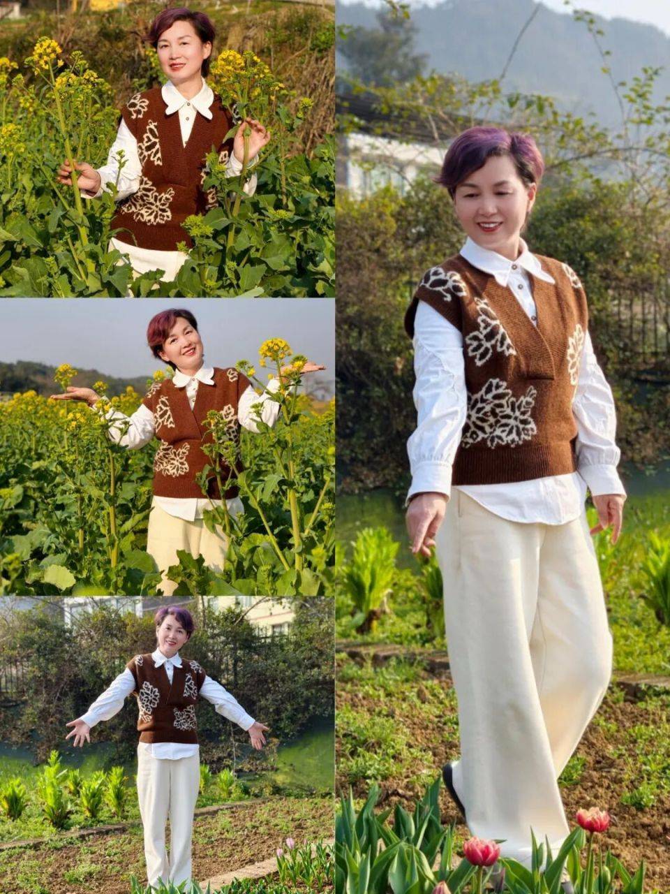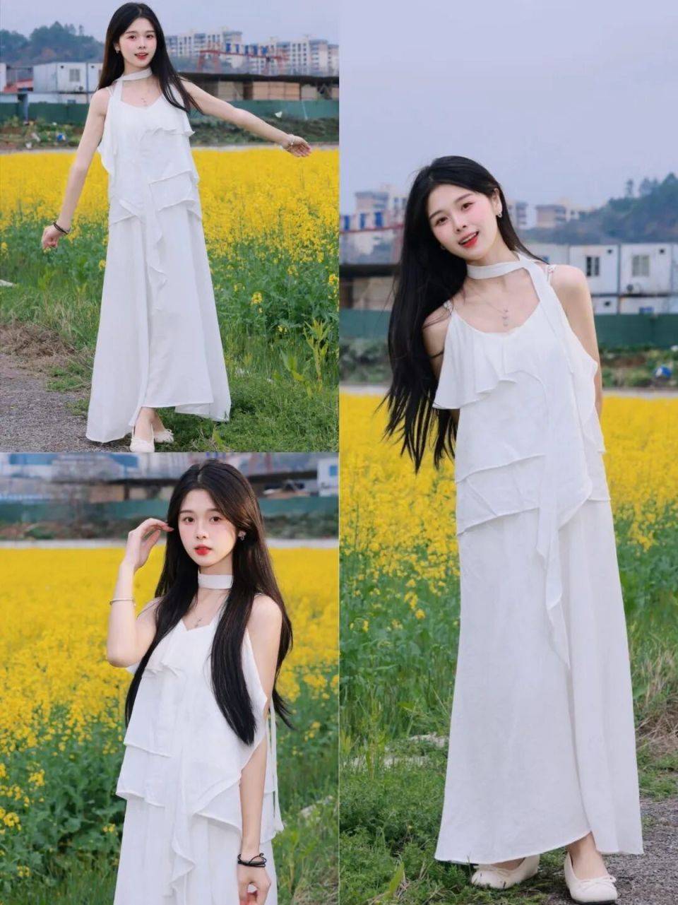 再配上一双浅口白色玛丽珍鞋,干净、温柔、清甜,站在油菜花田边,风一吹,裙摆轻扬,整个人干净得像初见时的心动,美成初恋本身,随手一拍都是温柔到骨子里的画面。