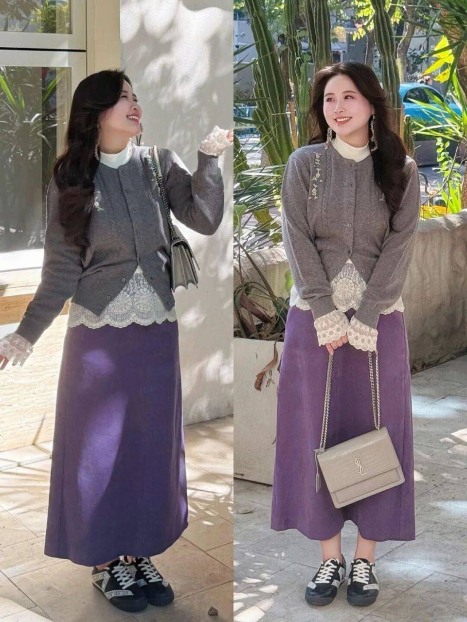 对于微胖女性来说,我个人更推荐你选择上面这种,既有温柔元素的灰色针织开衫,内搭一件蕾丝边设计的打底衫,让你穿在身上既温柔又有女人味,再结合上紫色的直筒半裙,脚踩德训鞋,这能够使得穿搭者既温柔又休闲洋气,通勤时髦。