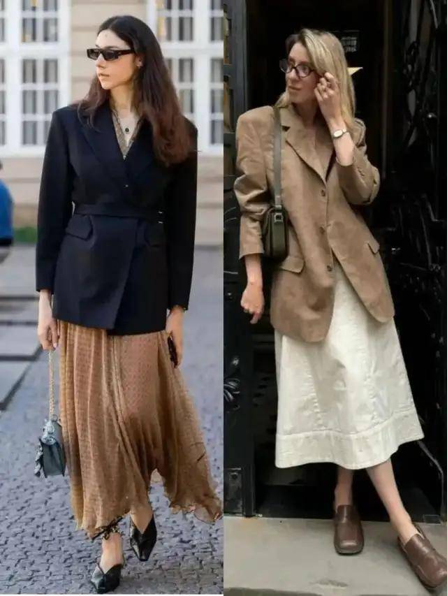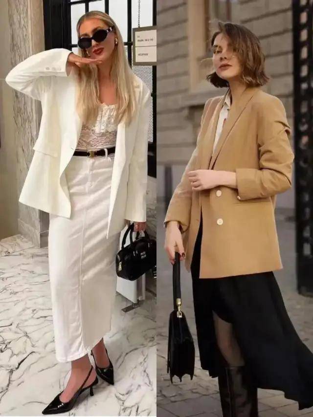 西服配裙子很适合职场女性进行穿搭,刚柔并济,能让你变得干练,同时又温柔优雅。