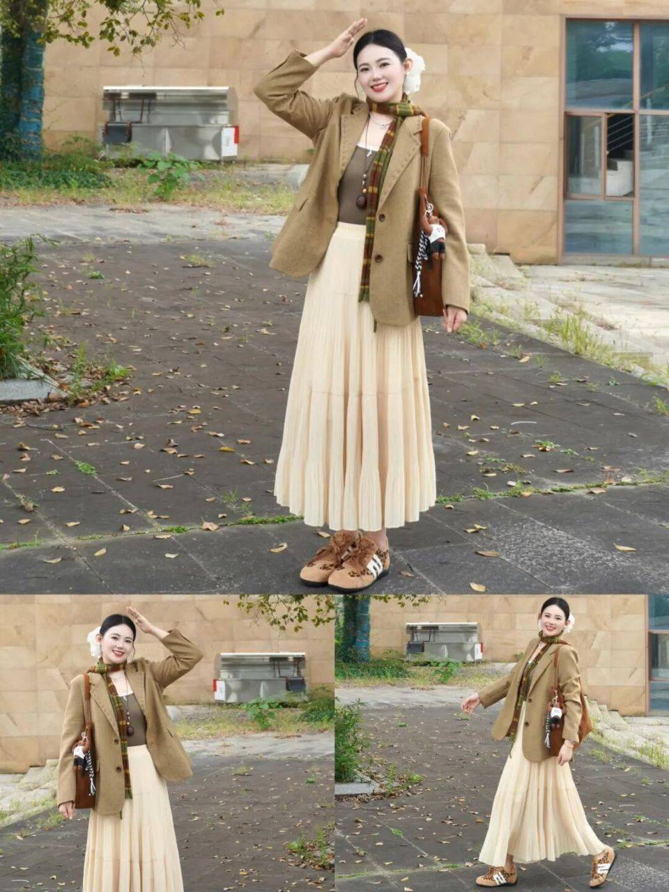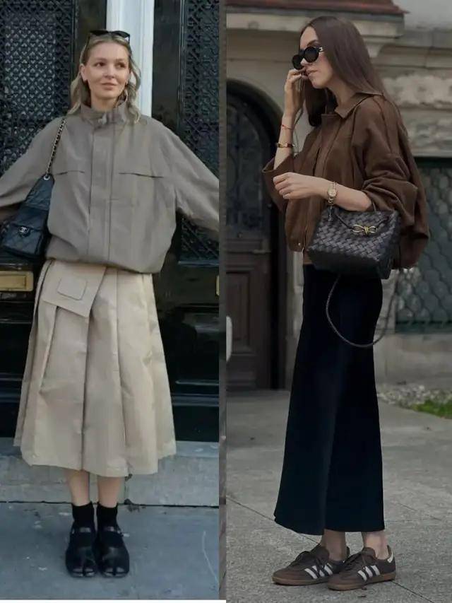 若是偏爱通勤风,带点休闲感的,直接用西装外套搭配上杏色的伞裙,脚上穿的大地色的德训鞋,休闲又干练又优雅。