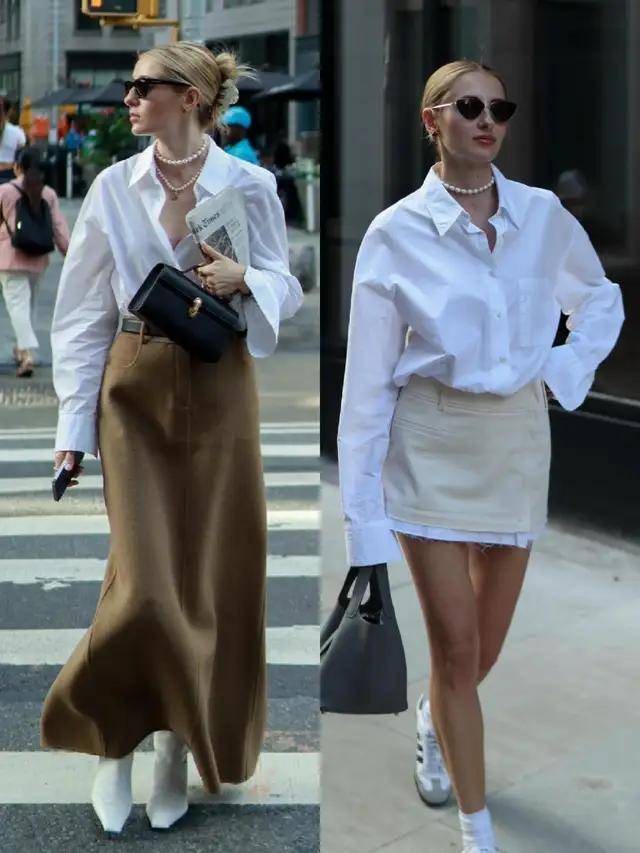 或是选择小众设计的衬衫上衣,搭配上白色的压褶伞裙,脚上穿的大地色系的浅口单鞋,结合卷发造型,既简约又优雅,百搭又耐看,很适合咱们普通大众。