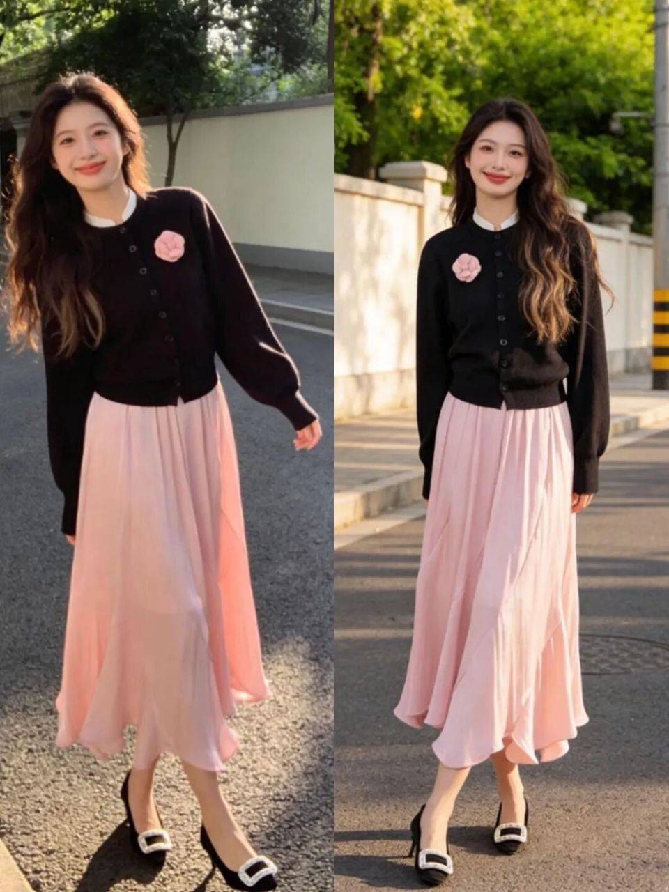 或是选择一件黑色的针织开衫,搭配上粉色的半裙,若是偏爱少女气息,选择粉色裙子来穿搭,少女感自显,不必刻意装嫩。