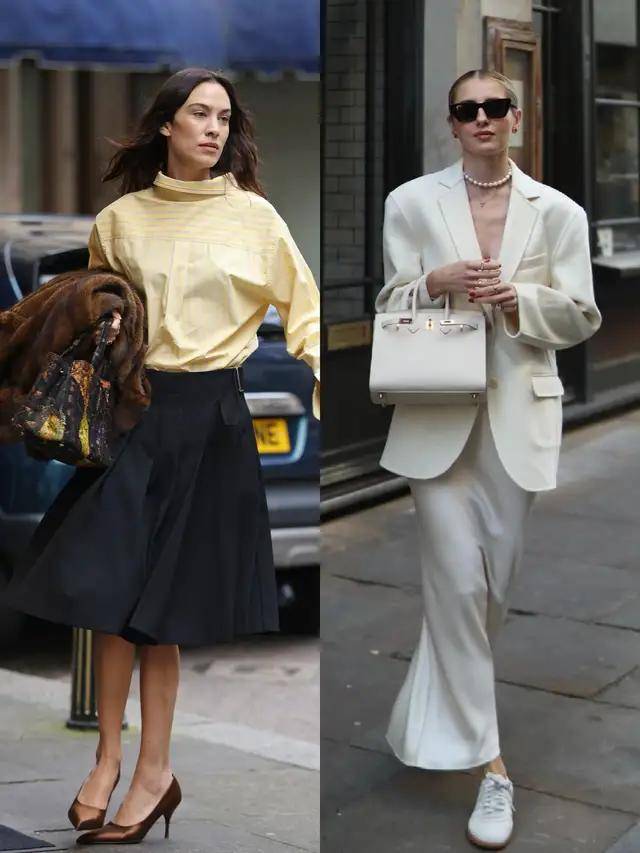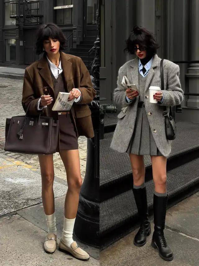 像上面这两套穿搭,采用了挺括有型的西装外套,搭配上直筒短裙、压褶短裙,利落又有气场,轻松穿出修长身材比例,以高级感元气满满。