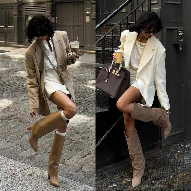 身材高挑纤瘦的女生,选一件卡其色西装外套内搭白色衬衫,以白色短裙,脚踩一双美拉德色系的中筒靴,这种低饱和度和亮色组合搭配形成撞色,层次感分明。