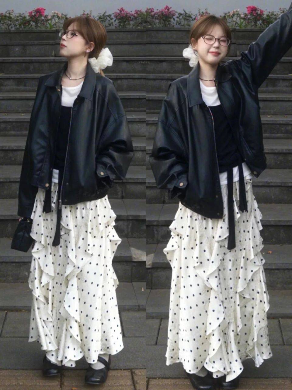 同样是穿皮衣外套,但是下半身的裙装不一样,穿出来的效果也有一定的区别,例如上面用的就是黑白波点的木耳边伞裙,配上黑色皮衣外套,这样的打扮方式比较俏皮甜美。