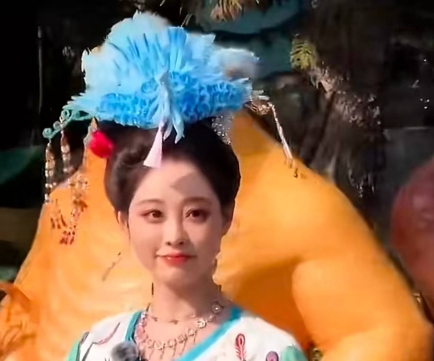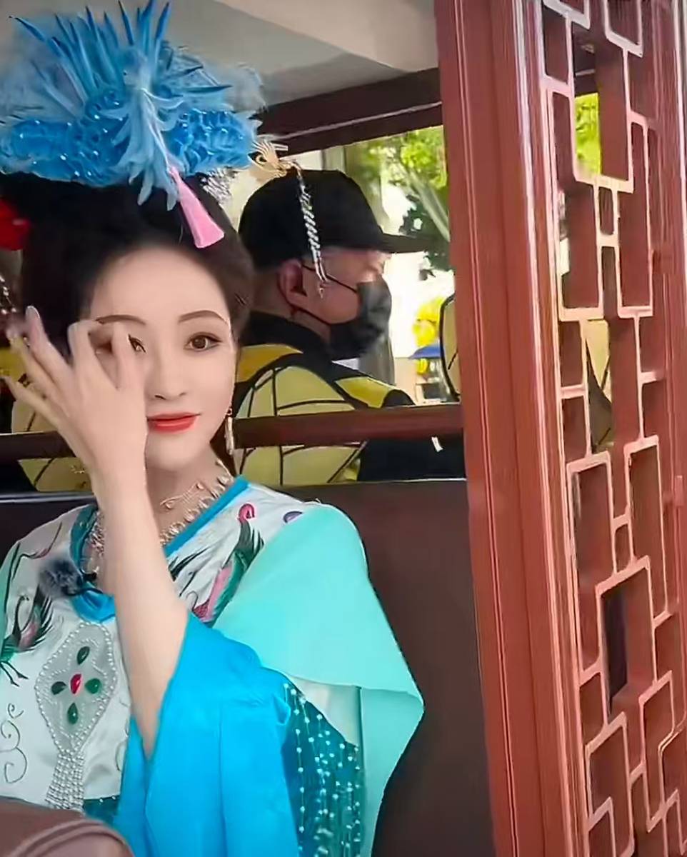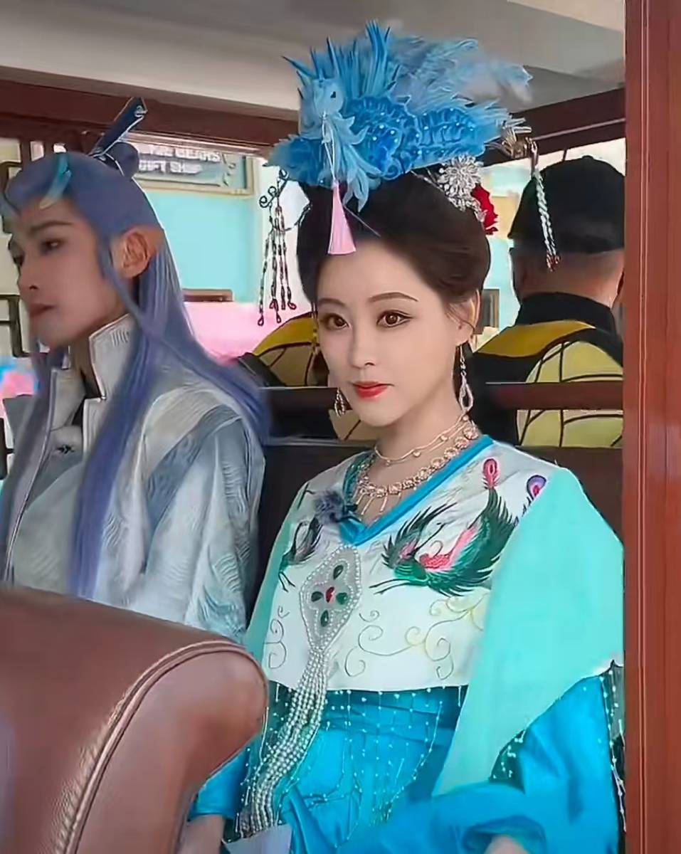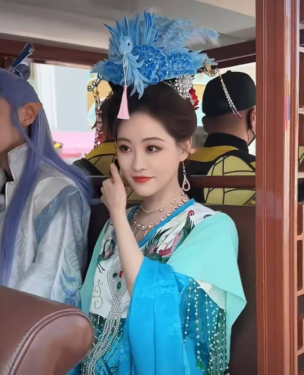 在主题巡游中,她身着蓝绿古装,搭配蓝羽发饰,灵动娇俏,互动吸睛。蓝绿古装的色彩搭配清新独特,蓝羽发饰则为整体造型增添了华丽感与灵动性,使她在巡游中成为焦点。