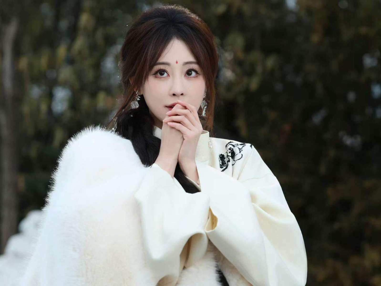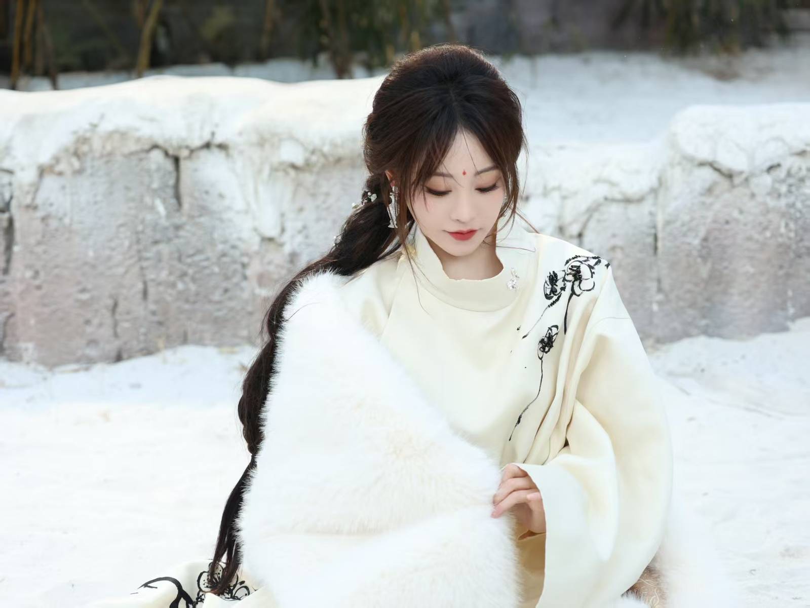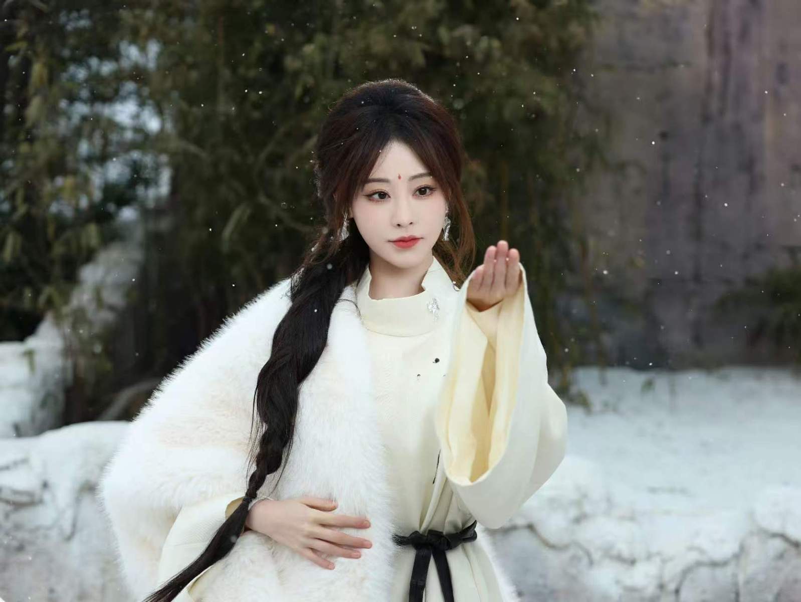 在古风造型方面,她有着独特的表现力。在古风雪景写真中,她身披白色披肩,额间点缀花钿,梳着侧编发,整体造型营造出清冷又温婉的氛围,尽显古典韵味。这种造型巧妙地融合了传统元素,白色披肩增添了纯净之感,花钿作为古典妆容的特色点缀,凸显出她的精致五官,侧编发则为整体造型增添了几分柔美与灵动,让她仿佛从古代画卷中走出的女子。