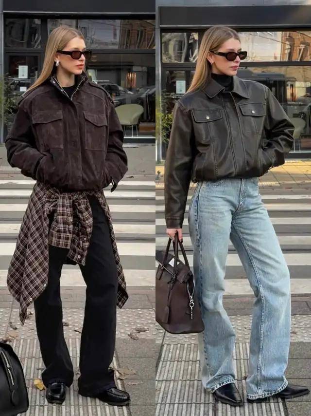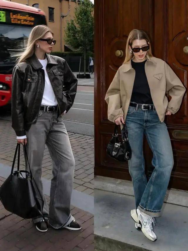当我们的穿衣风格偏酷飒风,不妨可选黑色的皮鞋配上蓝色牛仔直筒裤,再加上黑色的皮衣外套和黑色针织衫,戴上墨镜,走起路来自带风。
